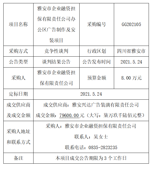 雅安市企業(yè)融資擔(dān)保有限責(zé)任公司辦公區(qū)廣告制作及安裝項(xiàng)目競(jìng)爭(zhēng)性談判結(jié)果公告